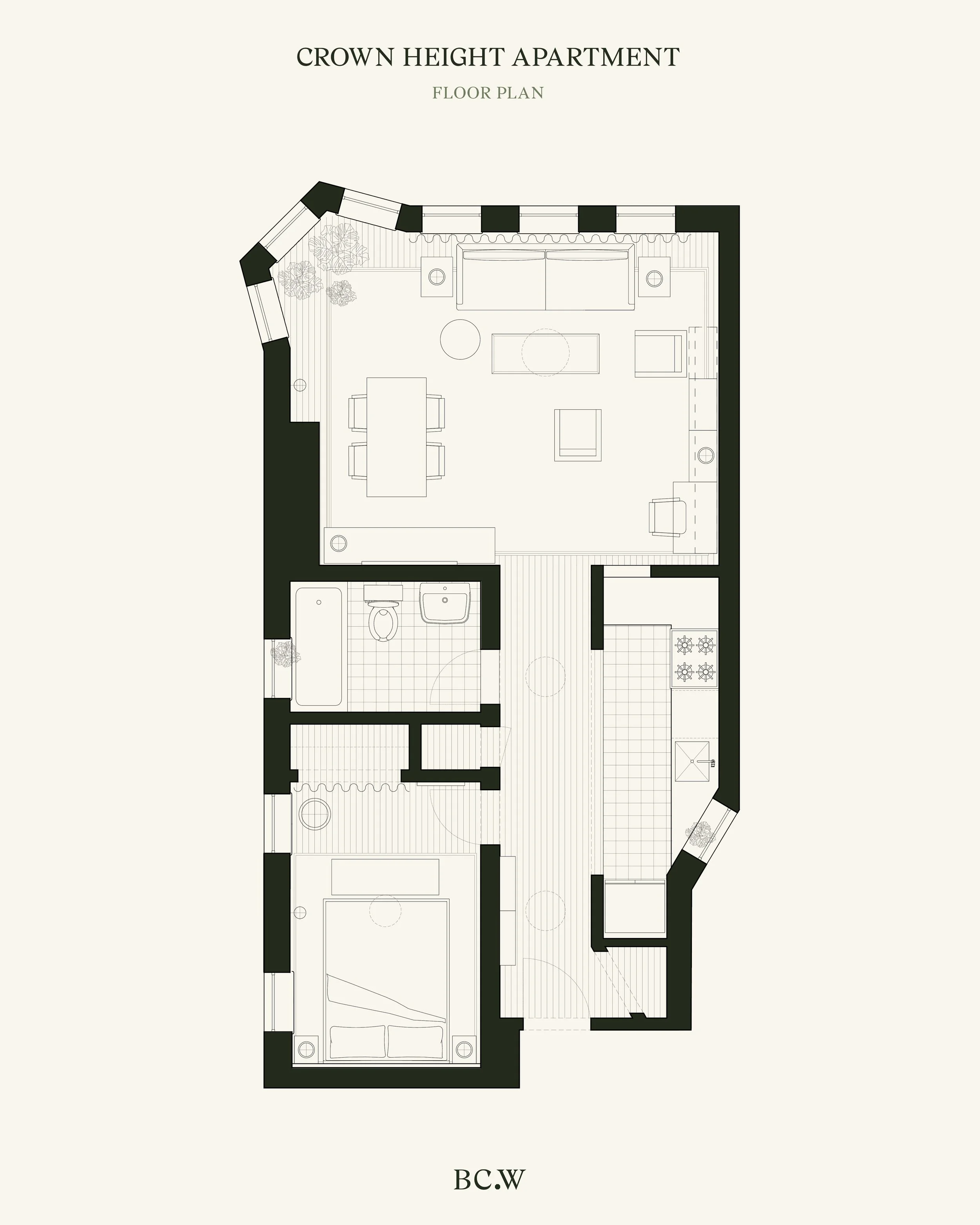 Even before the lease was signed, the client had fallen for a postmodern sofa and pieces of vintage art that set the palette and tone for the space. Guided by these criteria, BC.W composed an interior where Postmodernism’s polished confidence meets the tactile warmth of Folk Art, an interest the client brought to the table. Chrome and lacquer counterbalance physically and conceptually woven materials, creating harmony and depth. In the living area, generous amounts of furniture properly define zones for work, dining, and rest, while a custom quilt, headboard, and floating, lacquered nightstands bring softness and individuality to the bedroom.